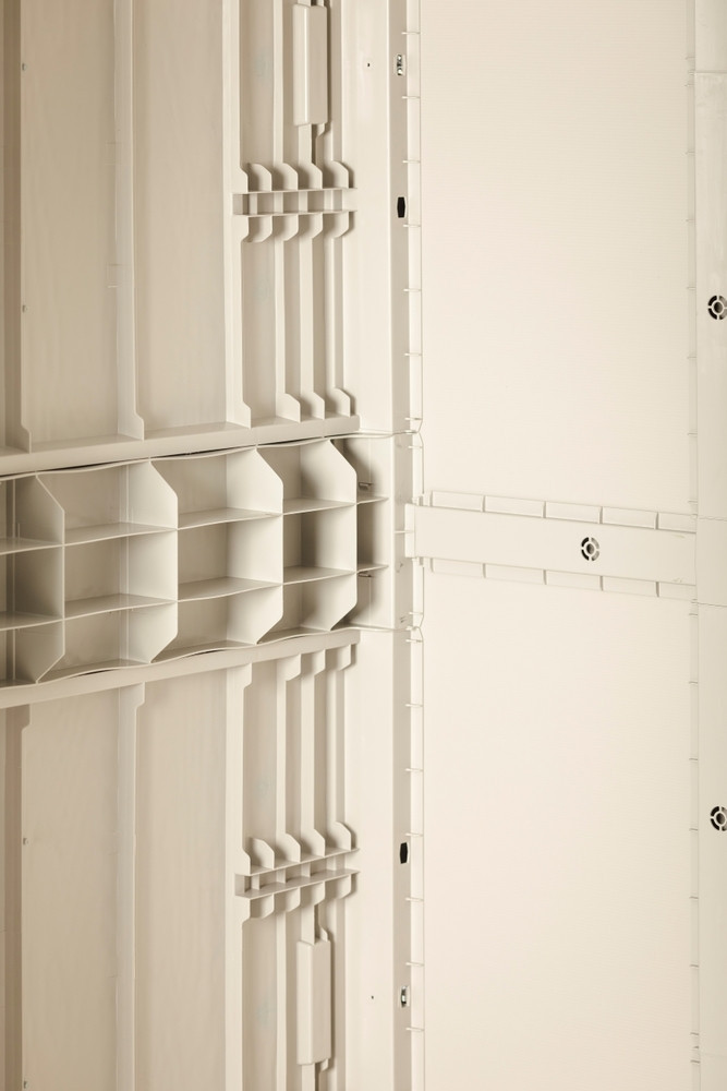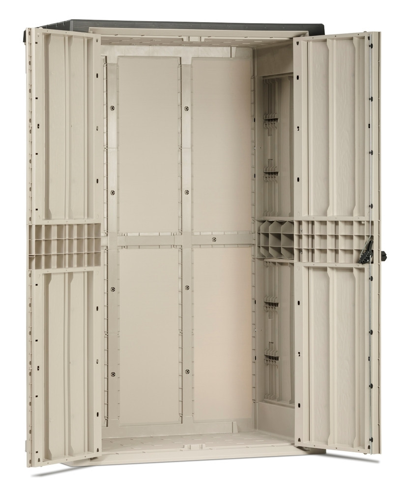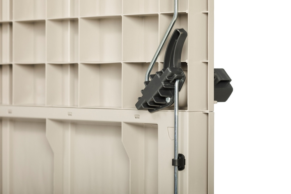 A szekrény kiváló minőségű újrahasznosított műanyagból készült, amely nem csak az intenzív napfénynek, hanem a nehéz időjárási viszonyoknak is ellenáll, ami garantálja a hosszú élettartamát. A reteszelés lehetősége biztosítja a szerszám biztonságát és nyugalmát az illetéktelen személyektől - a lakat nem része a csomagnak.