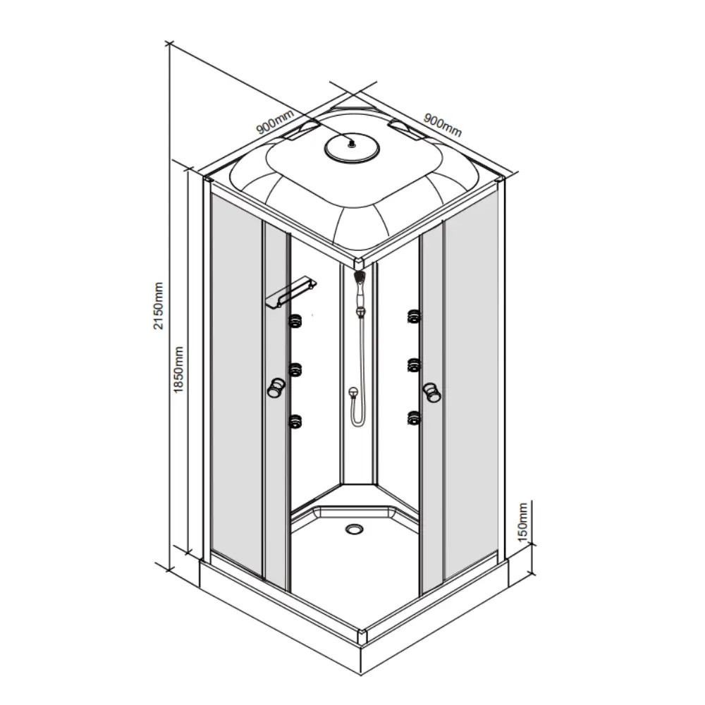 • Magasság: 185 cm (kabin), 215 cm zuhanytálcával együtt