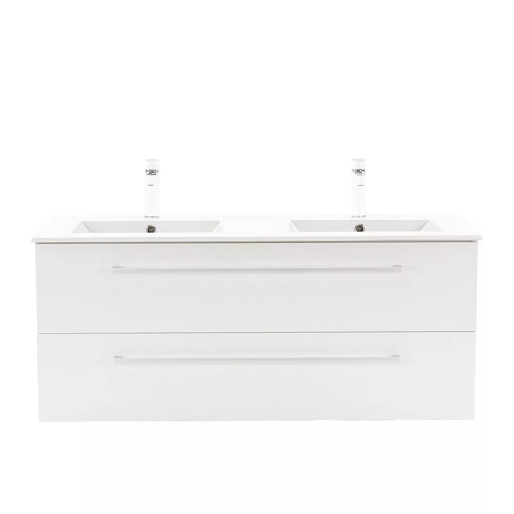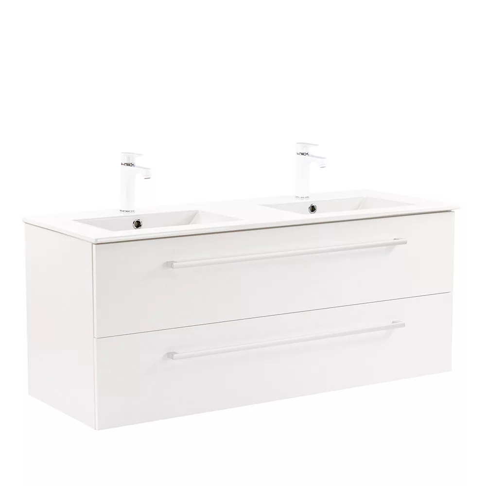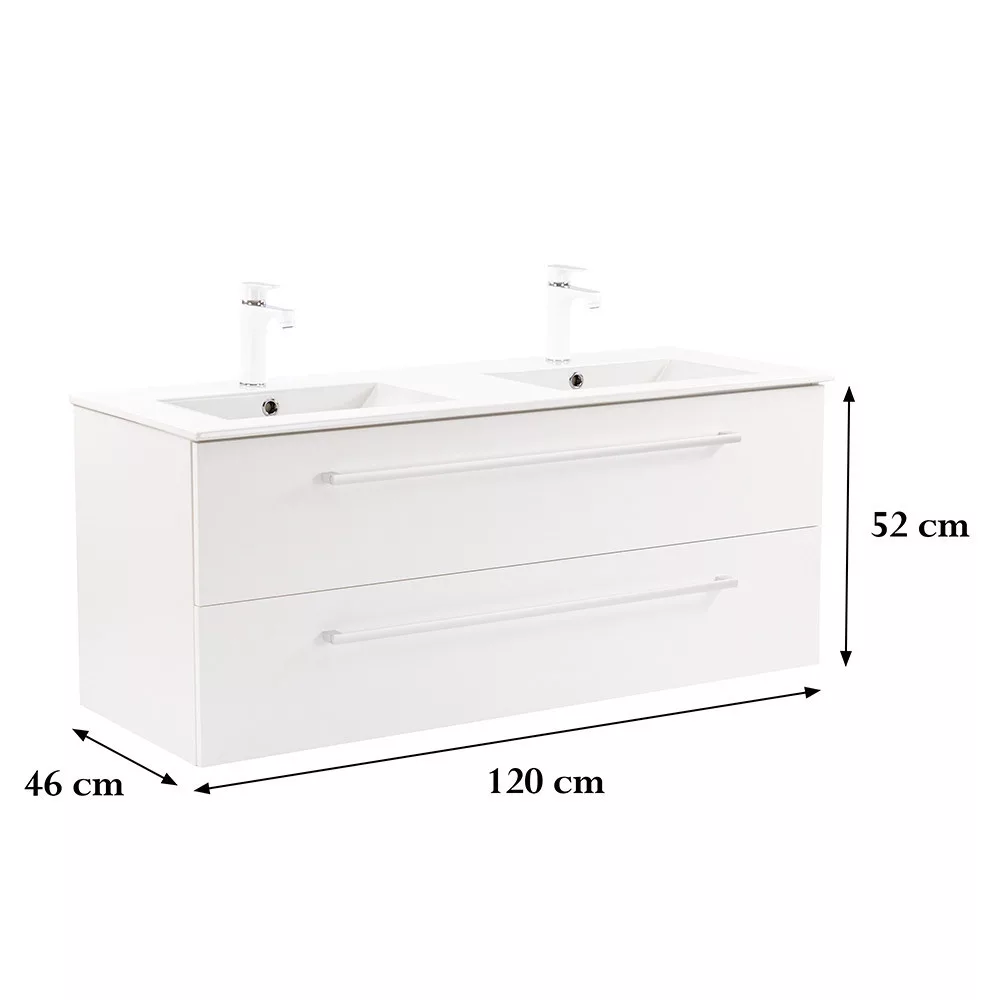 • Elegáns és praktikus mosdó: A bútor flat design kerámia mosdóval érkezik, amely két medencés kivitelű. Modern, esztétikus és könnyen tisztítható.