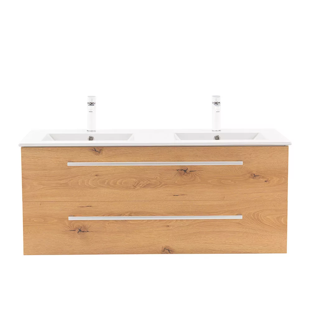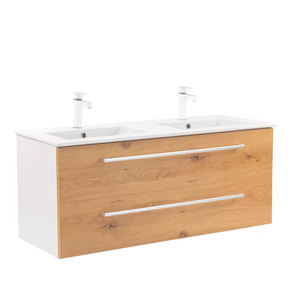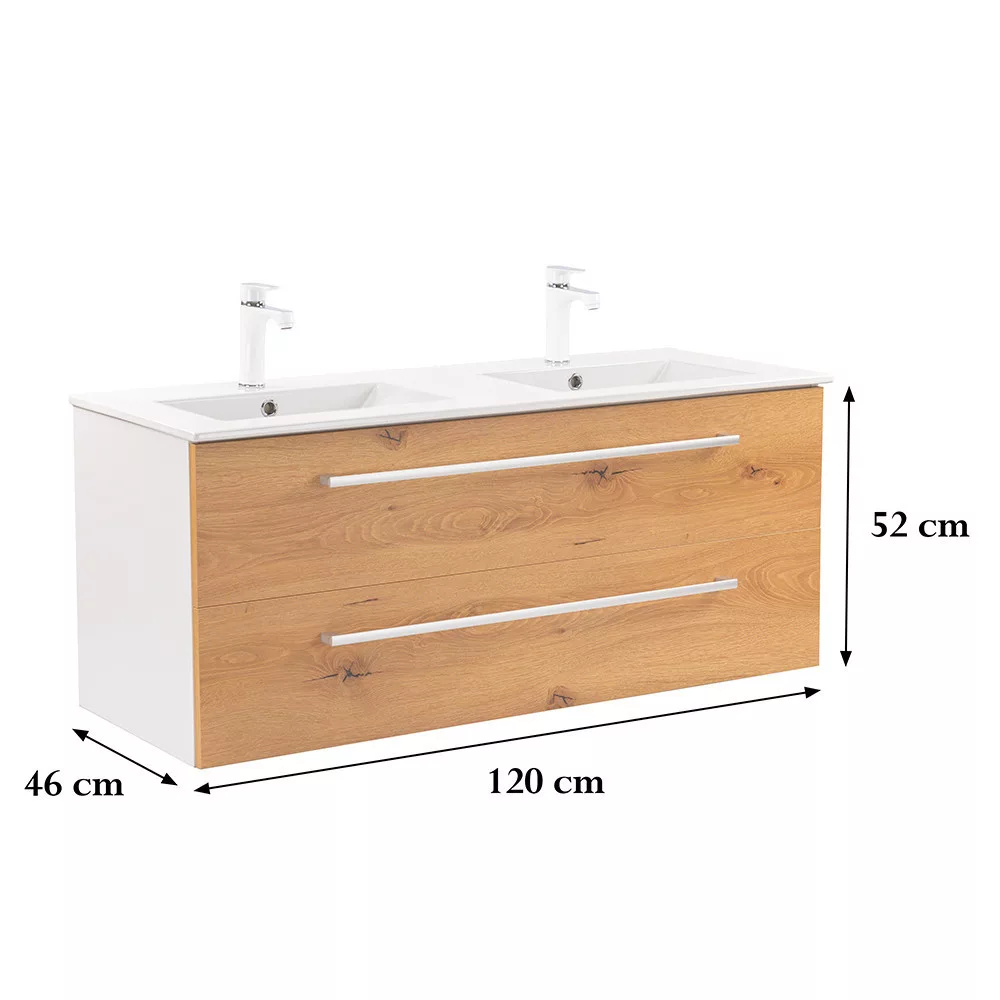 • Elegáns és praktikus mosdó: A bútor flat design kerámia mosdóval érkezik, amely kétmedencés kivitelű. Modern, esztétikus és könnyen tisztítható.