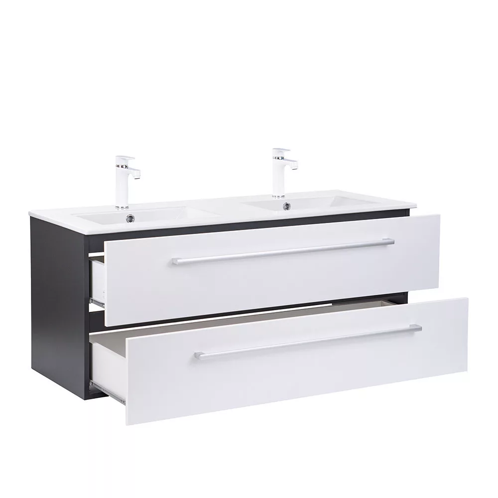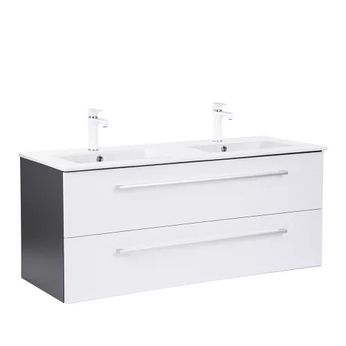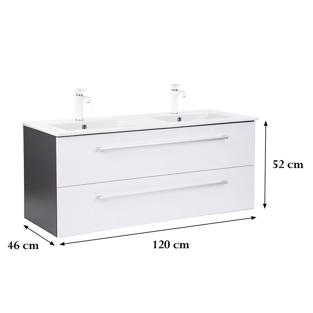 • Elegáns és praktikus mosdó: A bútor flat design kerámia mosdóval érkezik, amely kétmedencés kivitelű. Modern, esztétikus és könnyen tisztítható.