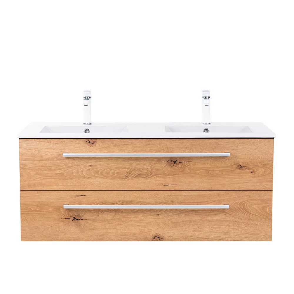 • Elegáns és praktikus mosdó: A bútor flat design kerámia mosdóval érkezik, amely kétmedencés kivitelű. Modern, esztétikus és könnyen tisztítható.