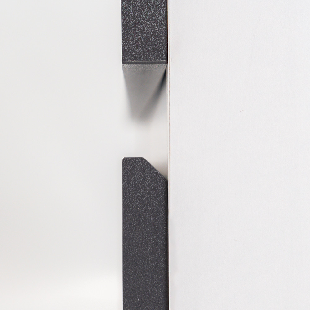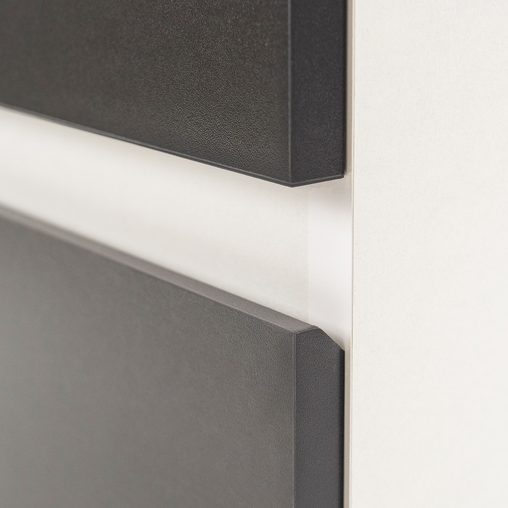 Az fehér korpusz és a antracit front kombinációja elegáns és időtálló megjelenést kölcsönöz a bútornak.