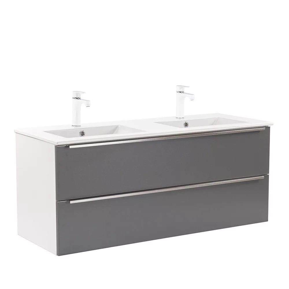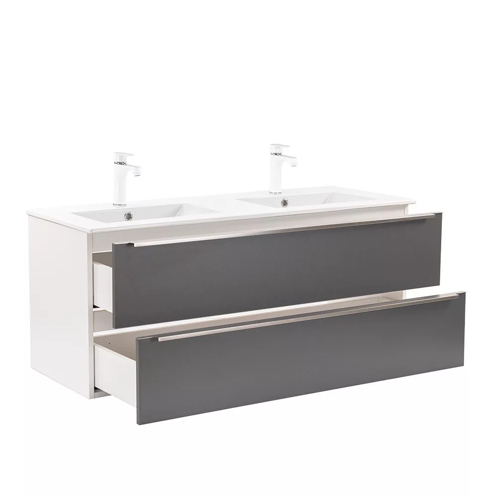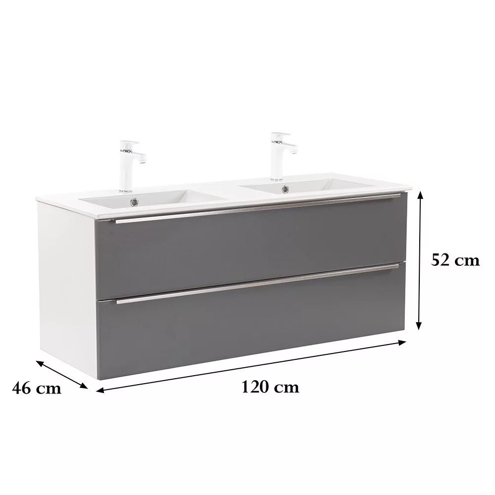 • Elegáns és praktikus mosdó: A bútor flat design kerámia mosdóval érkezik, amely kétmedencés kivitelű. Modern, esztétikus és könnyen tisztítható.