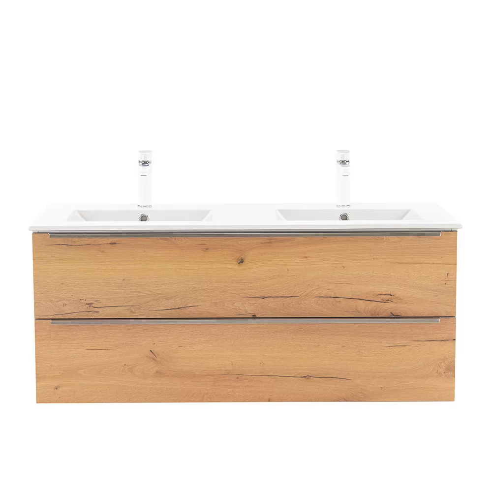 • Elegáns és praktikus mosdó: A bútor flat design kerámia mosdóval érkezik, amely kétmedencés kivitelű. Modern, esztétikus és könnyen tisztítható.