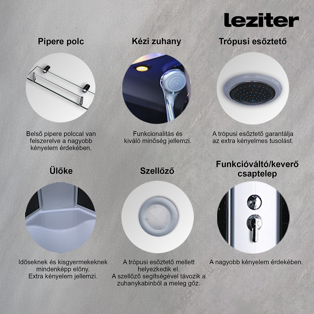 Zuhanykabin kényelmét fokozó eszközök: 6 hátmasszírozó fúvóka, alu hátsó panel, 2 zuhanyfej: esőztető fejzuhany, kézi zuhany, keverő csaptelep, funkcióválasztó kar, elektronika, kezelőpanel, rádió, hangszóró, hátsó és felső hangulatvilágítás, felső világítás, pipere polc, lábmasszírozó, ülőke.