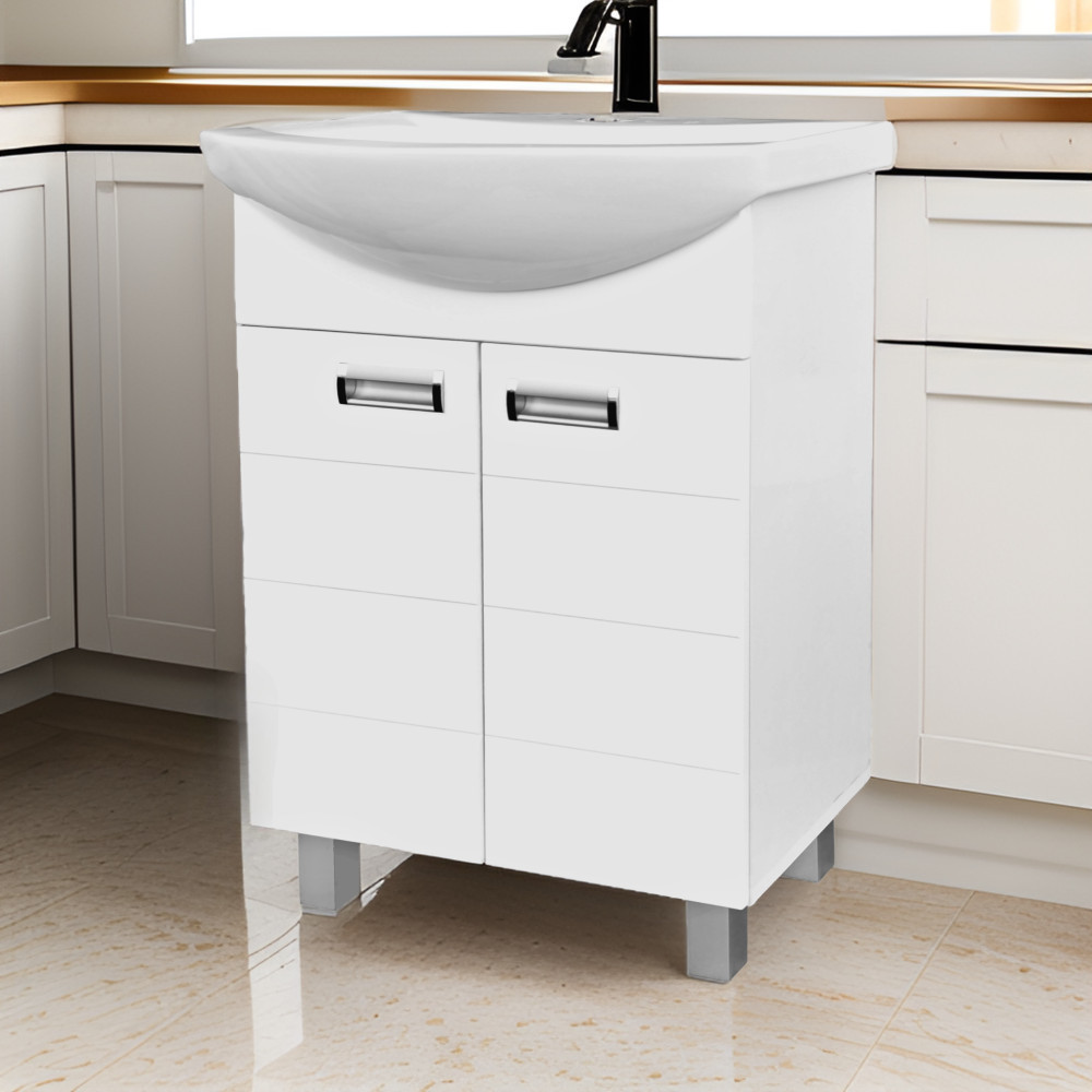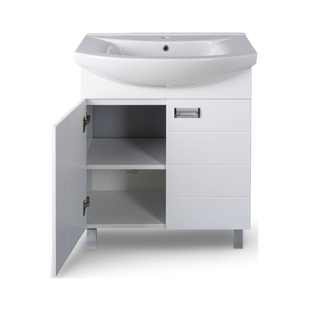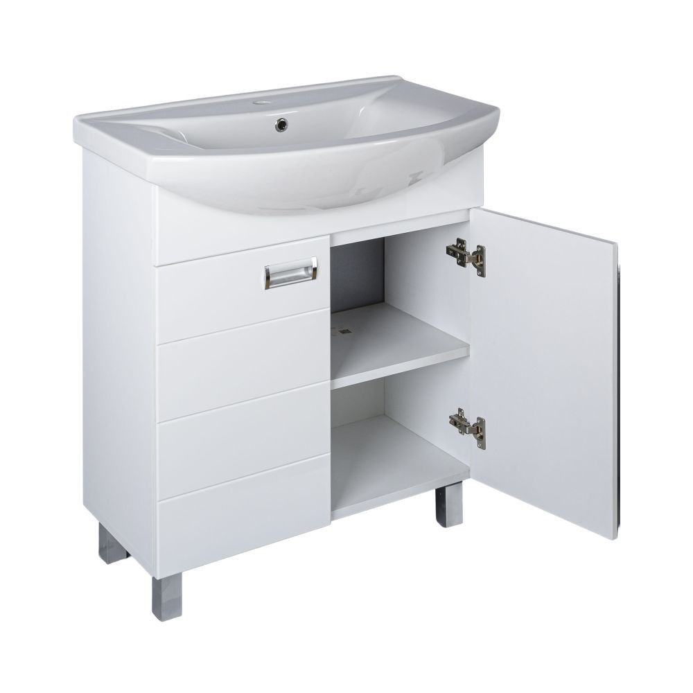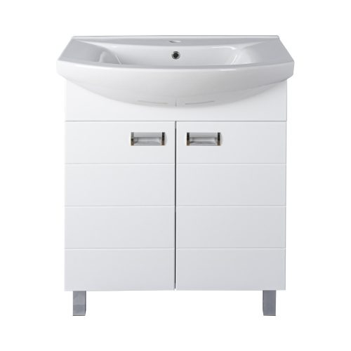 A szekrény egyenes magasfényű fronttal rendelkezik egyedi mart díszítésekkel kiegészítve, amelyhez egy hozzáillő íves porcelán mosdót kínálunk (csaptelep nélkül), amely kombináció kiváló összhangot biztosít fürdőszobájának. Továbbá a szekrény 2 nyíló ajtóval is rendelkezik, amelyek magas minőségű fém zsanérokkal vannak felszerelve.