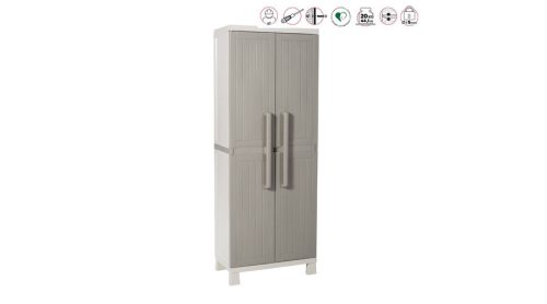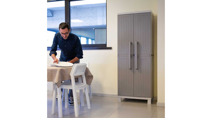A WOOD MIDI multifunkciós szekrény 2A egy kompakt és praktikus műanyag tároló megoldás, amely elsősorban garázsba, pincébe vagy gardróbba ajánlott. Két ajtaja könnyű hozzáférést biztosít a benne elhelyezett háztartási eszközökhöz, miközben védi azokat a portól és nedvességtől. Négy belső polcának köszönhetően alkalmas seprűk, tisztítóeszközök és egyéb kellékek rendszerezett tárolására. Ez a szekrény kiváló választás azoknak, akik szeretnék otthonuk rendezettségét hosszú távon fenntartani.