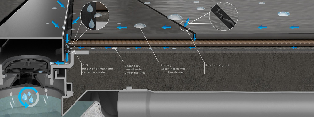 *ALS rendszer a Frameless Line, Slim Line és a Wall Drain modellek speciális tulajdonsága amely lehetővé teszi, hogy a csempék alól szivárgó vagy kondenzációs víz a lefolyóba kerüljön.