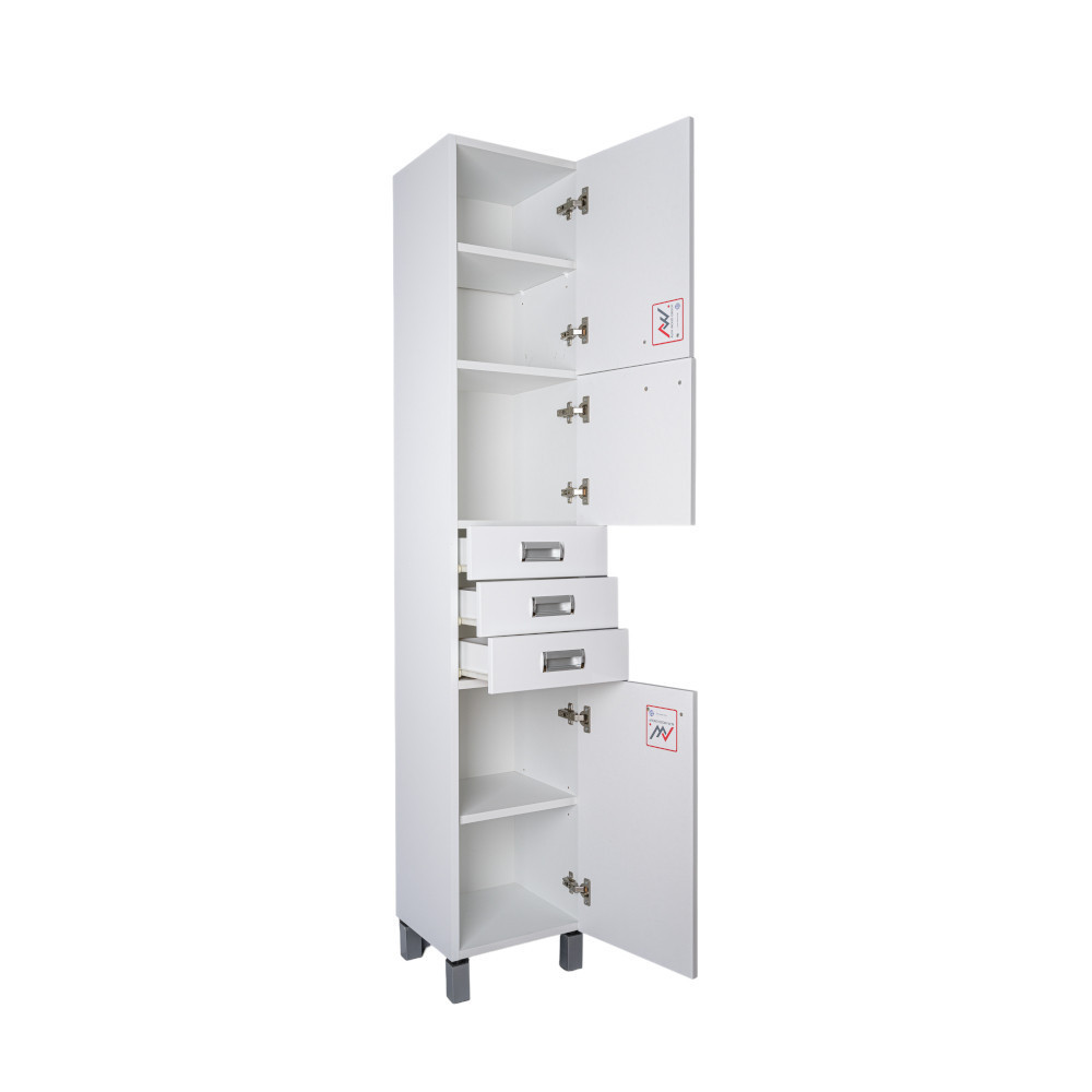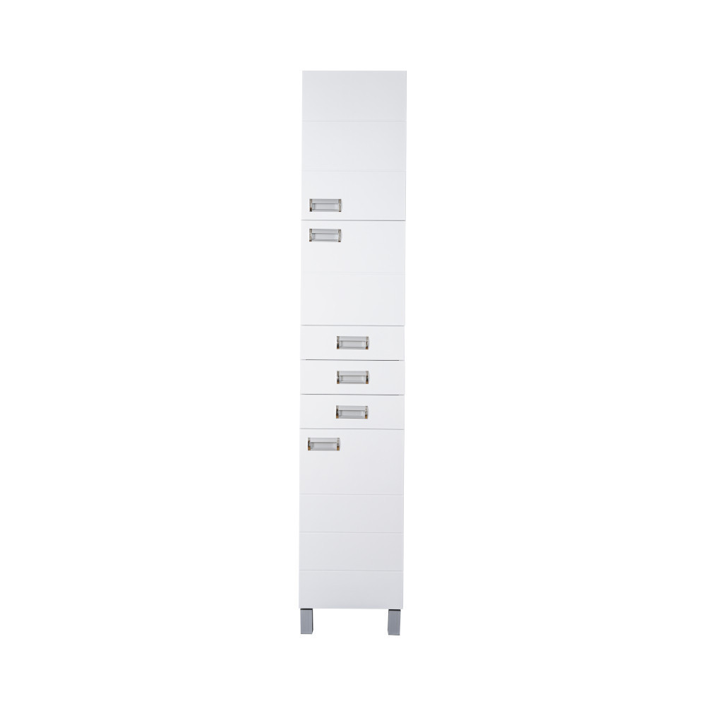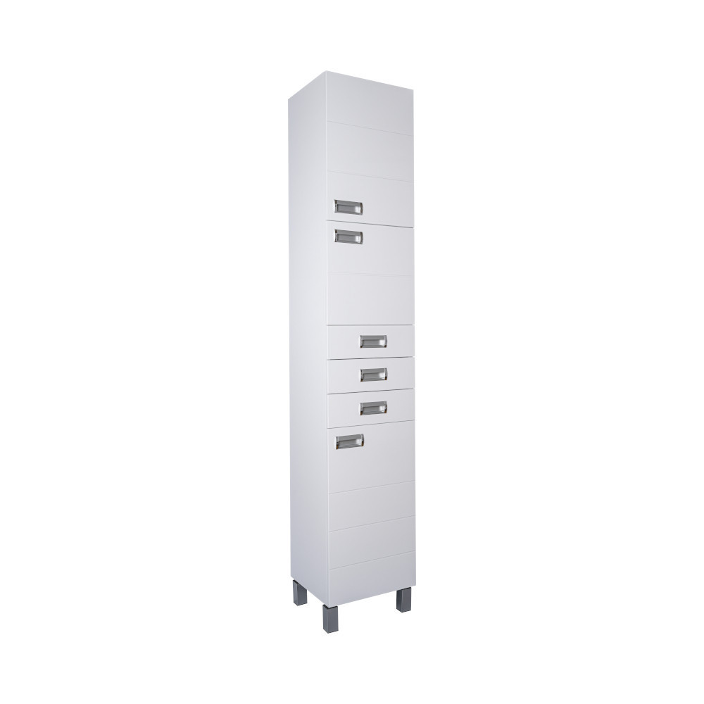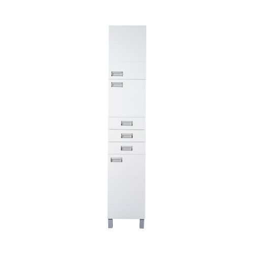 A Szquare állószekrény magas polcos praktikus és hasznos megoldást kínál. Polcaiban tárolhatók a kisebb ruhaneműk, törölközők vagy tisztító és tisztálkodó eszközök és szerek. Ezen felül még 3 fiókkal rendelkezik. Fehér színével szinte mindenhová beilleszkedik és esztétikus környezetet teremt. Rendezze be úgy fürdőszobáját, hogy a végeredmény örömet szerezzen a szemnek és szolgáljon sokáig!