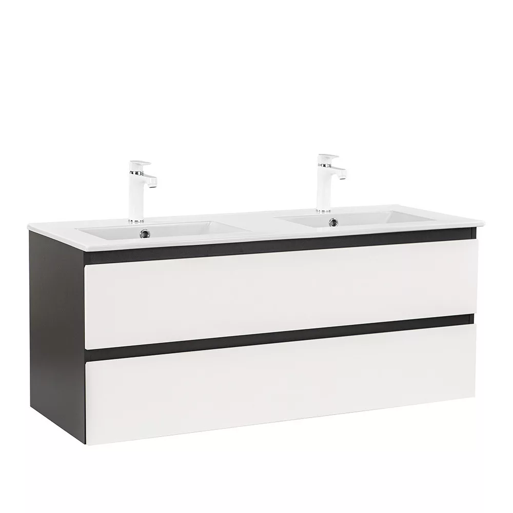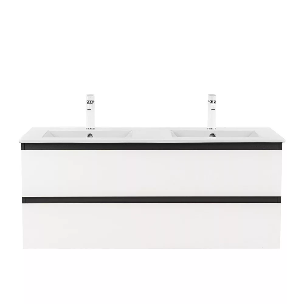 A bútor flat design kerámia mosdóval érkezik, amely két medencés kivitelű. Modern, esztétikus és könnyen tisztítható.
