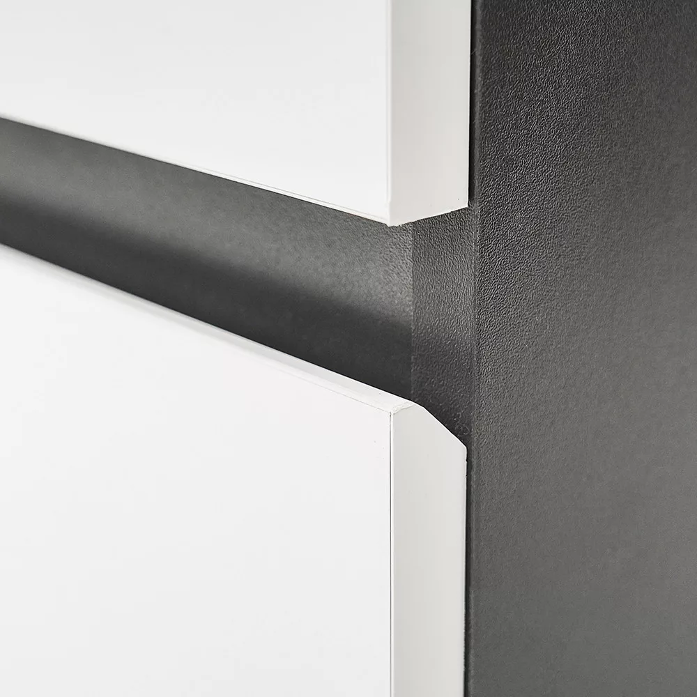 Az antracit színű korpusz és a fehér front kombinációja elegáns és időtálló megjelenést kölcsönöz a bútornak.