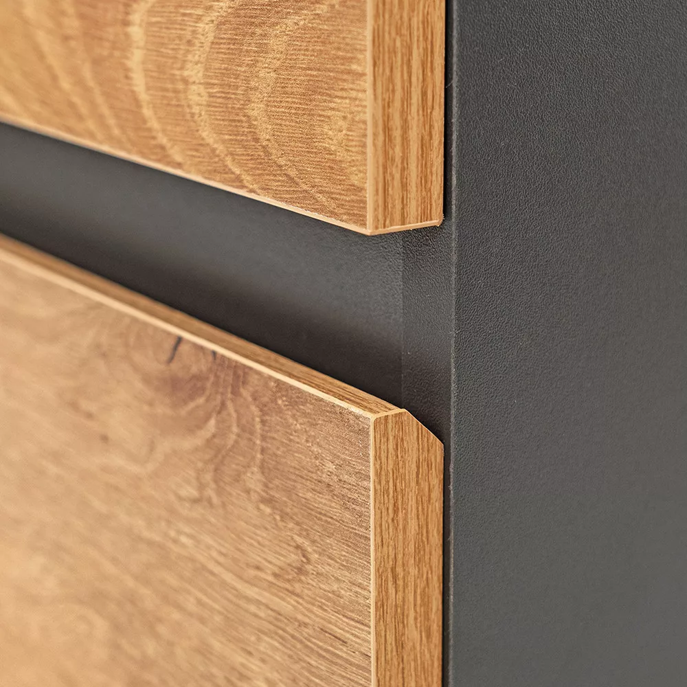 Az antracit színű korpusz és a tölgy front kombinációja elegáns és időtálló megjelenést kölcsönöz a bútornak.