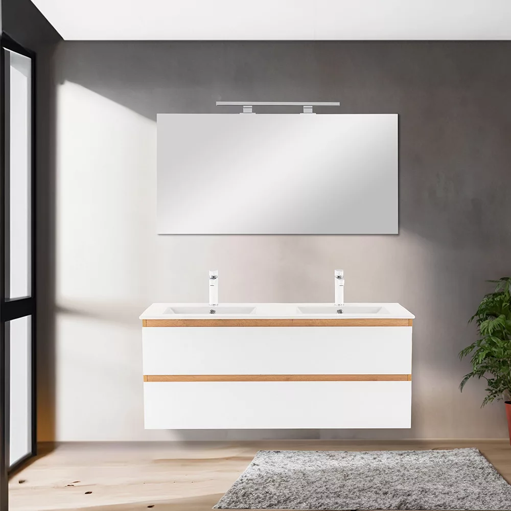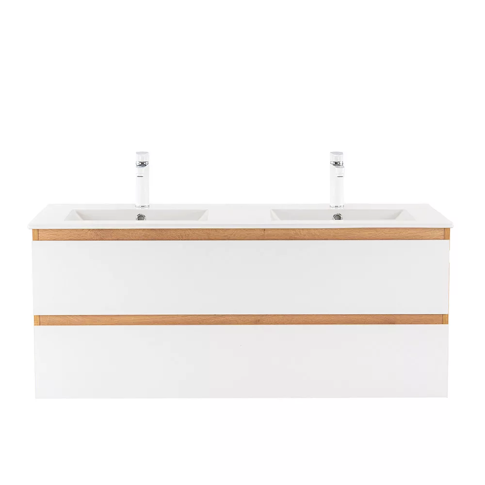 • Elegáns és praktikus mosdó: A bútor flat design kerámia mosdóval érkezik, amely kétmedencés kivitelű. Modern, esztétikus és könnyen tisztítható.
